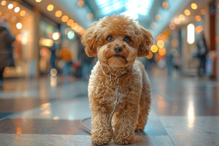 Curly-haired dog standing in a busy shopping mall, showcasing a blend of urban life and pet companionship. With Generative AI technology.
