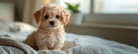 Small curly-haired puppy sitting on cozy bed, looking with curiosity, soft fur blending harmoniously with peaceful atmosphere of home.