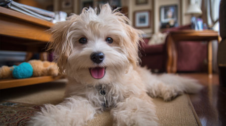 Maltipoo dog with fluffy untrimmed fur posing indoors in a casual setting