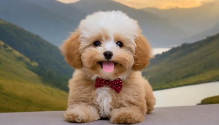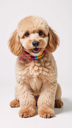 A photorealistic illustration features an adorable poodle wearing a colorful ribbon