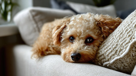 A fluffy dog is resting comfortably on a couch, displaying a curious and warm expression. The pet