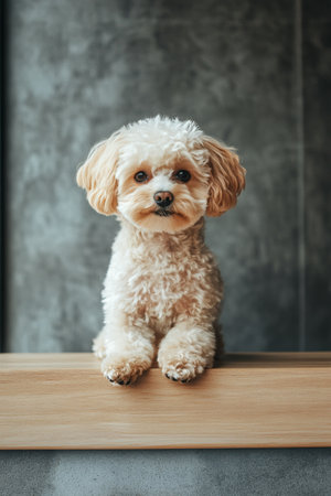 Cute little poodle dog lying on wooden table and looking at camera
