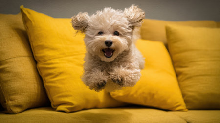 Happy fluffy dog jumping over yellow cushions on a cozy sofa, showcasing joy and playfulness in a bright living room setting with vibrant colors