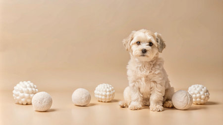 A small, white dog sits in front of a beige background with white balls scattered around it.