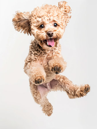 Cute miniature poodle dog jumping on white background. Studio shot.