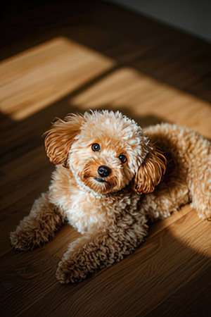 Cute Miniature Poodle lying on a wooden floor. Selective focus.