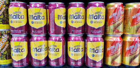 UALA LUMPUR, MALAYSIA - JANUARY 17, 2018: Cans of non-alcohol malt drink at Mid-Valley Shopping Centre, Kuala Lumpur