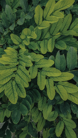 Vibrant green leaves create a lush, textured pattern, illuminated with natural light. The close-up shot captures the intricate details of the foliage.