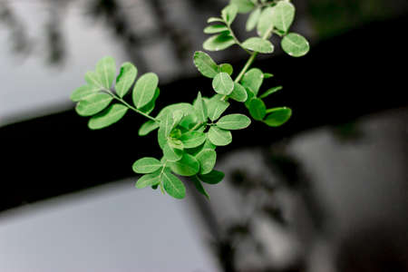 Old wood empty table for product display in front of green moringa (Drumstick tree (Moringa oleifera) leaves