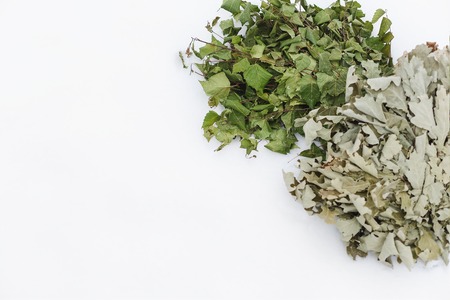 Organic dry herbal tea leaves, close up. Composition of dried teas from above, copy space.