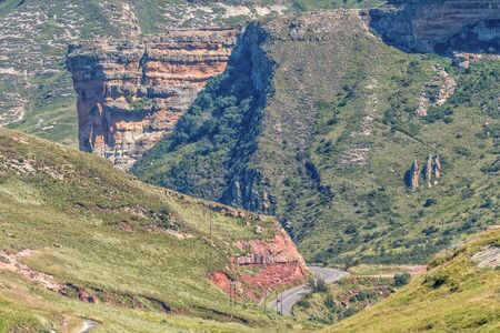 Landscape at Golden Gate. Rooidraai, road R712 and the Brandwag Buttress are visible