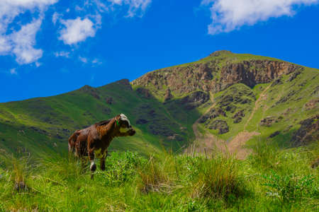 Calf on a Beautiful Green Meadow at North Caucasus, Elbrus Region, Russia