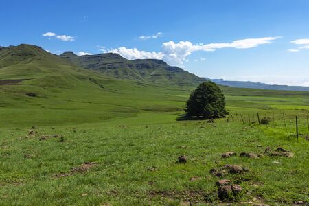 FOURIESBURG, SOUTH AFRICA - MARCH 18, 2020: The farm landscape on road R711 between Clarens and Fouriesburg. The Mohlala Rock and vehicles are visible