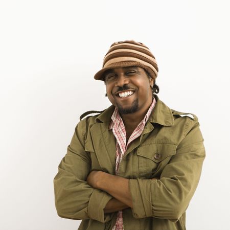 African-American mid-adult man wearing hat and smiling at viewer with arms crossed.