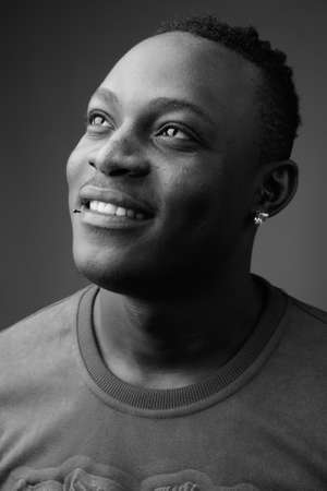 Studio shot of young smiling african man standing isolated on dark background, dressed in light t-shirt.