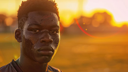 The close up picture of the african soccer or football player is exhausted after exercising or playing football, the football player require training, physical endurance and football technique. AIG43.