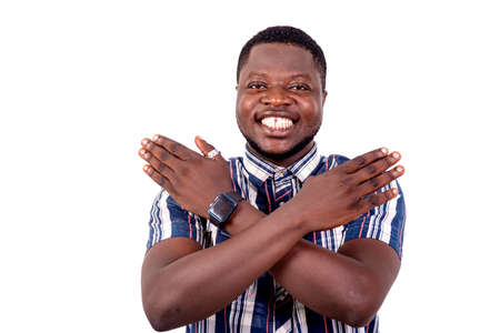 portrait of a handsome happy young man showing cross gesture with his arms while smiling.