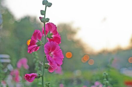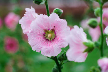 Beautiful pink Hollyhock flowers in the g blooming in arden