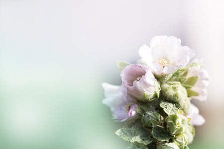 Delicate pink mallow flower on a beautiful background. Spring theme. Copy space.