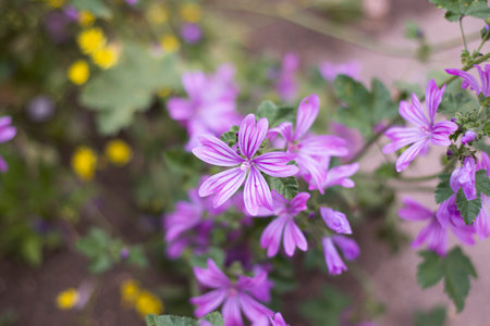 Purple mallow flowers on the plant.