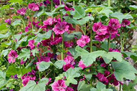 Violet mallow - flowers bloom in the garden, floral landscape.