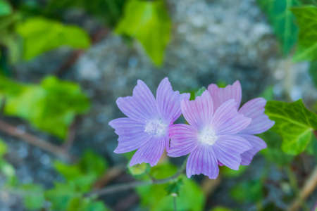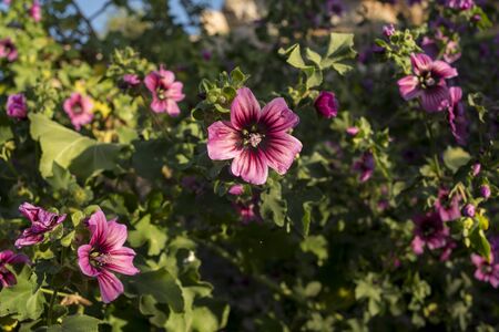 Close-up of beautiful flowers in the sun in spring. Malva common. Malva sylvestris. Common mallow.