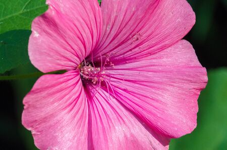 Beautiful pink flower. Pink mallow in the garden, closeup.