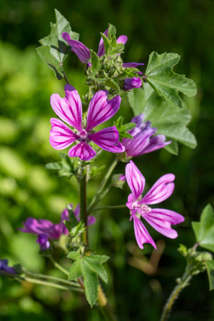 Purple mallow flowers on the plant.