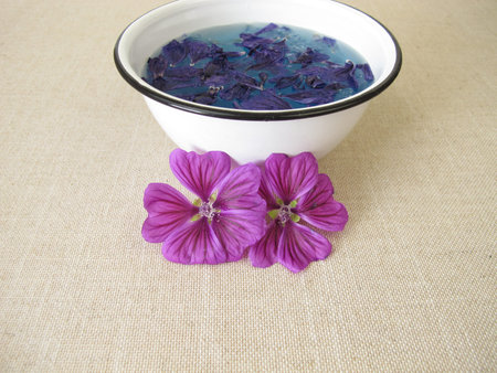Blue dye bath with mallow flowers, blue plant color