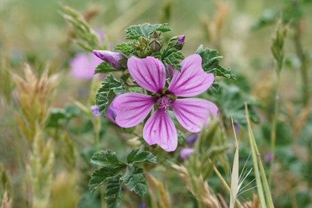 Malva sylvestris common mallow plant considered a weed that grows throughout the Andalusian fields with beautiful large flowers of purple pink and white light by flash