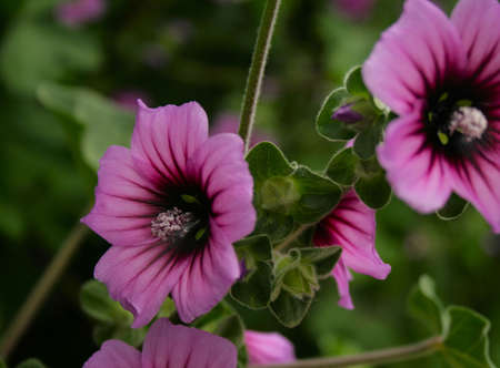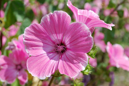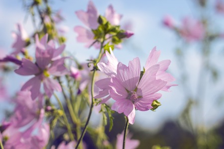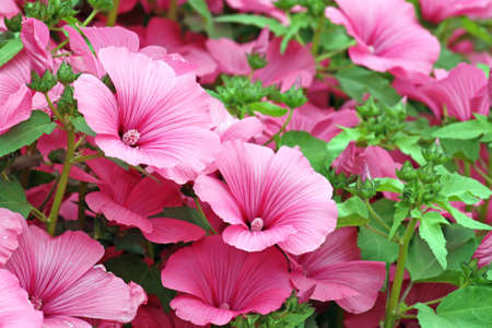 Pink mallow flowers blooming in the garden, closeup.