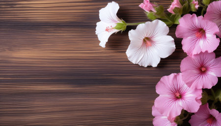 Pink and white flowers on a wooden background. View from above.
