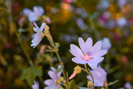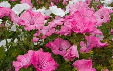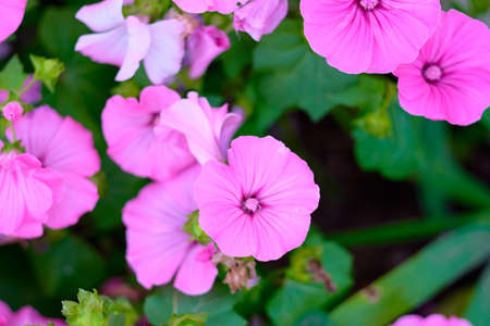 Beautiful pink flowers lavatera decorate a flower bed in the Park