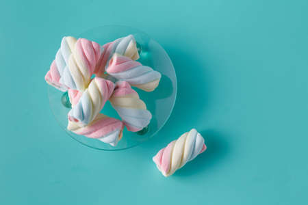 Multi-colored marshmallows. Top view. Background or texture of colorful blue and pink marshmallows.