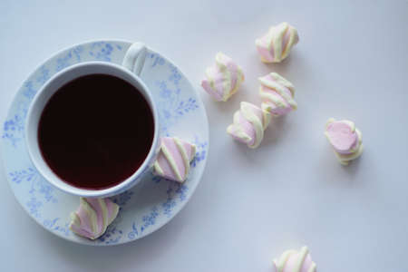 hot cup of red tea with marshmallow, tenderness concept