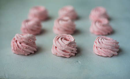 Meringue zephyr marshmallows on a light background. Pink sweet homemade marshmallow. meringue on white background. close up