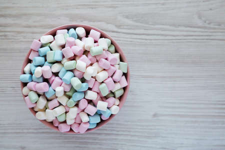 Rainbow Fruity Mini Marshmallows in a Pink Bowl on a white wooden background, top view. Flat lay, overhead, from above. Space for text.