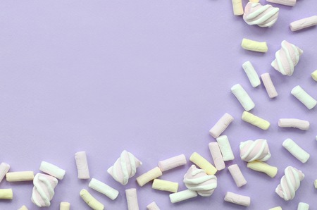 Colorful marshmallow laid out on violet paper background. pastel creative textured framework. minimal.