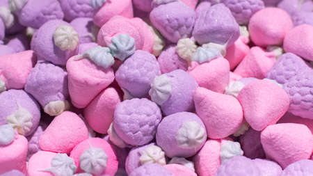 Candy marmalade marshmallow pink lilac in the shape of a raspberry strawberry berry. Background backdrop food wallpaper sweets