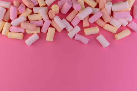 Pastel colored marshmallows on a pink background.Copy space.
