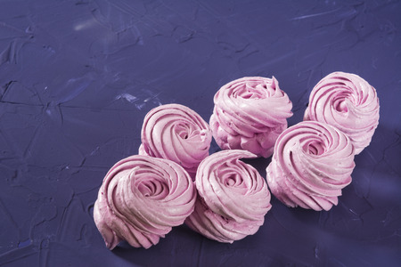 Many purple marshmallow on a dark surface. A contrasting picture.A work of culinary art