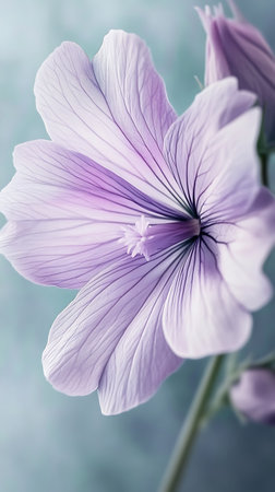 A close-up photograph accentuates the delicate patterns and textures on the petals of a soft lavender wildflower, its aesthetic beauty showcased against a blurred backdrop.