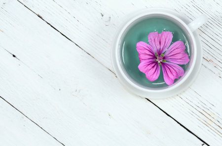 Herbal tea from fresh flowers of Wild mallow, lat. Malva sylvestris, flat lay, white wooden table. Medicinal herb is used against cough and inflammation.