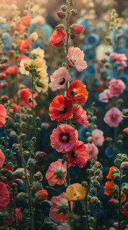 A close-up of a tall stem of hollyhock flowers in full bloom, with various colors such as red, pink, and yellow. The flowers are surrounded by other flowers in a field, creating a vibrant and colorful scene. The image is bathed in warm, golden light, highlighting the beauty of the flowers.