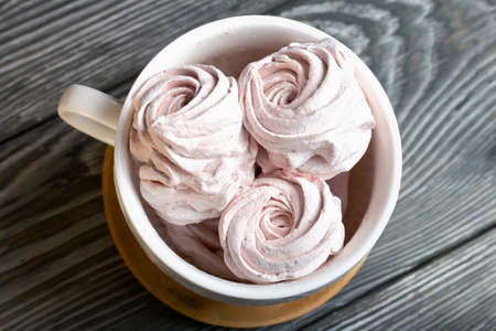 Homemade zephyr in a mug. On the surface of pine boards painted in black and white.