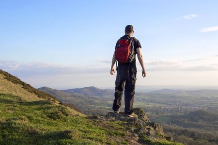 A lone hiker on top of a hill looking out on the ridge of the Malvern Hills, England. On a sunny winters day at sunset.
