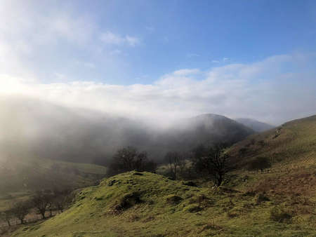 Beautiful Winter sunrise landscape image of The Great Ridge in the Peak District in England with mist hanging around the peaks