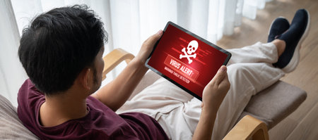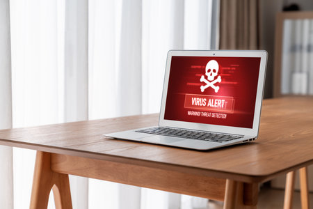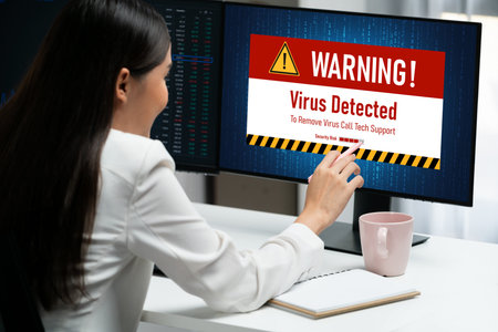 Cyber attacking concept. Malware alert showing on computer screen display scam and threat detection on computer system or online server to be removed brisk.