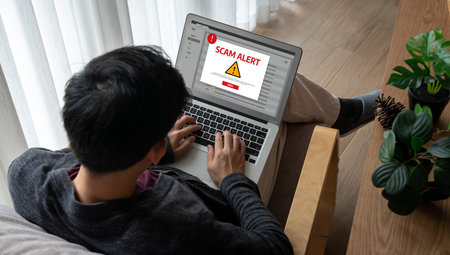 Email concept with laptop spam and virus computer monitor internet security concept, Businessman hold smartphone with a laptop. Spam, junk and e-marketing on screen, Spam Email Pop-up Warning.