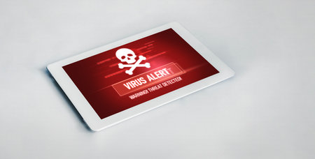 Woman working with tablet with virus warning notification on screen and is choosing a management method from the options clean, quarantine, delete. Virus alert warning and secure on mobile device concept.